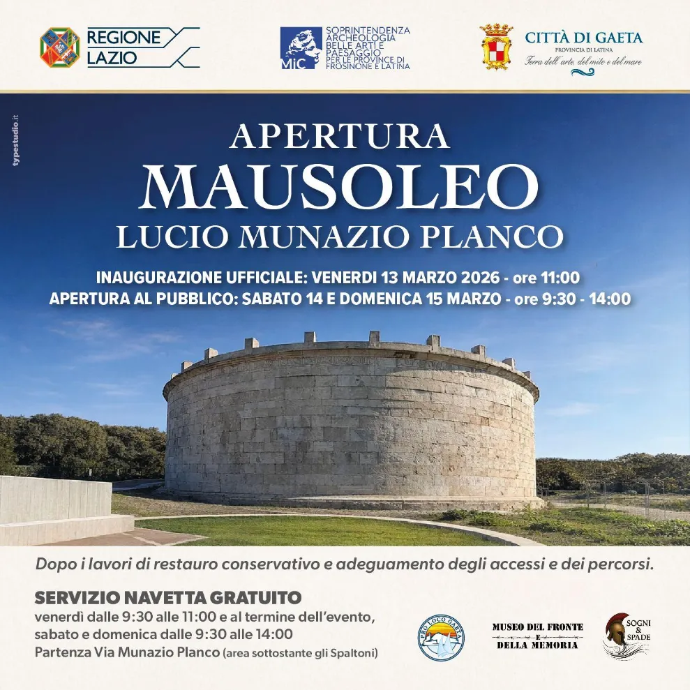 Il servizio di bus navetta gratuito per il Mausoleo di Lucio Munazio Planco è attivo sabato 14 e domenica 15 marzo 2026.