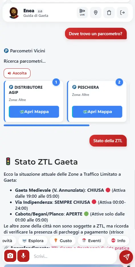- ZTL e Mobilità in Tempo Reale: Enea vede lo stato dei varchi (Attivi/Non Attivi) in questo preciso istante e guida gli utenti ai parcheggi disponibili con mappe interattive.
