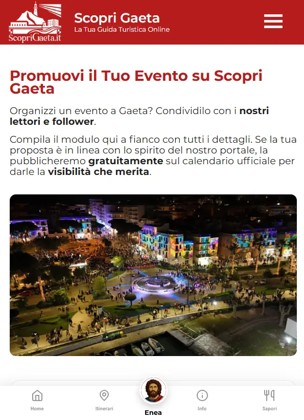 Crediamo nell’economia locale. Per questo, la sezione Eventi non è chiusa. I titolari delle attività possono pubblicare autonomamente i propri eventi. Hai un ristorante con musica live? Un negozio che fa un’apertura straordinaria? Su Scopri Gaeta hai una vetrina gratuita e potente, senza intermediari. È il nostro modo di supportare il tessuto imprenditoriale locale.